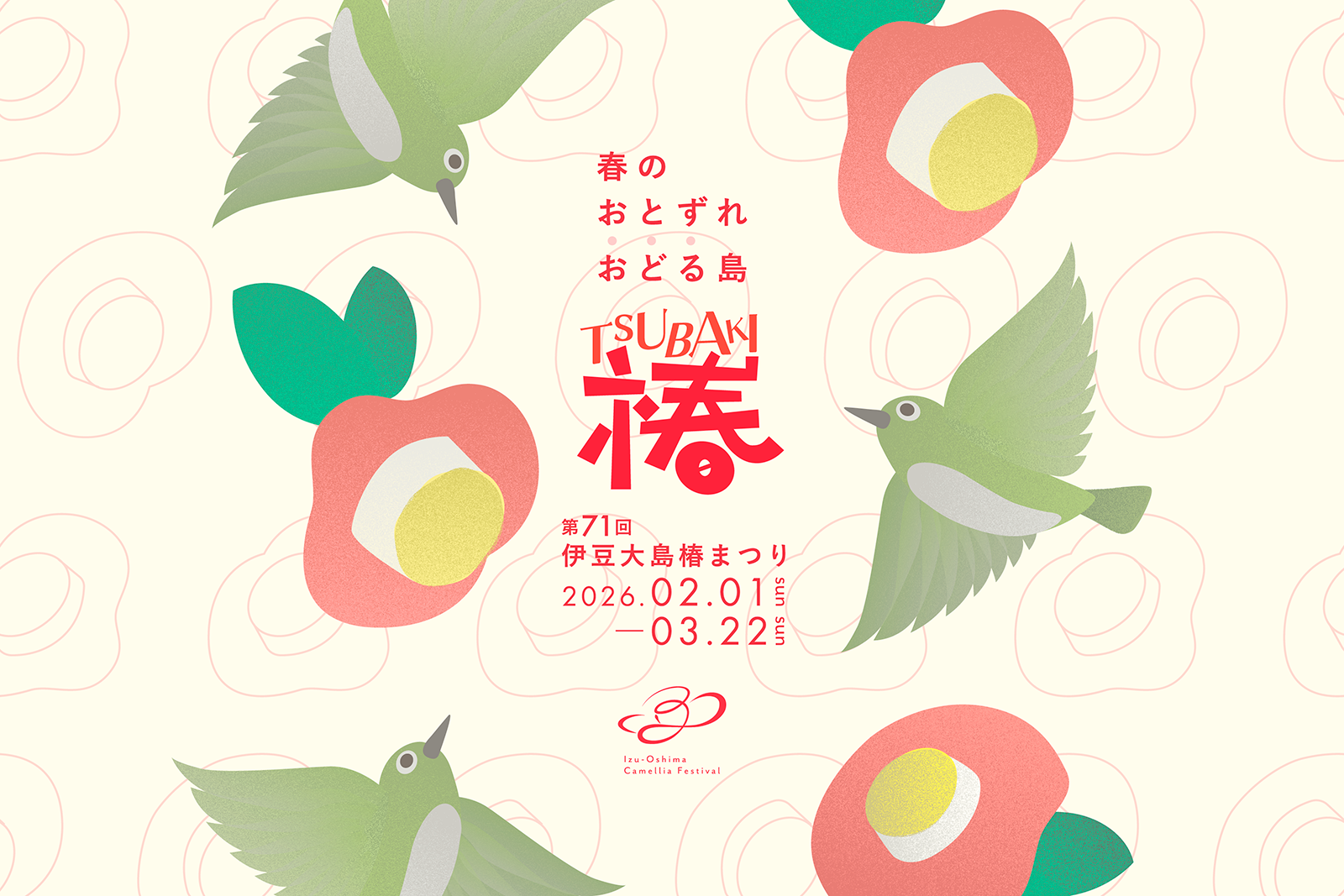 島を彩る椿の花とともに、一足早い春の訪れを楽しむ、島をあげての一大イベント「伊豆大島椿まつり」は、第71回を迎えます。今回は、サブテーマに「春のおとずれ、おどる島」を掲げ、椿の花が咲きほころぶ瞬間の高揚感や、島じゅうに広がるお祭りのような空気を表現しました。2026年2月1日から3月22日まで、椿とともにめぐる伊豆大島の風景と、心おどる春の気配をお楽しみください。総合案内所(メイン会場)は、元町港船客待合所へ。島の玄関口から各地を巡り歩きながら、春のおとずれとともに“おどる島・伊豆大島”をご堪能ください。
