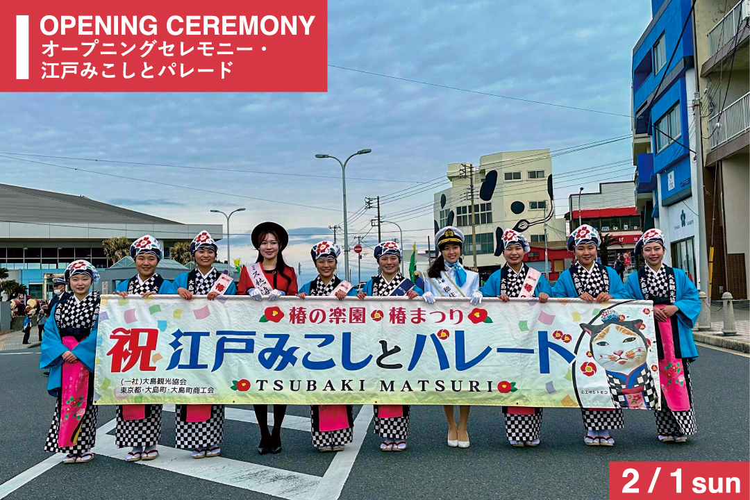 椿まつりの開幕を祝うオープニングセレモニーと、江戸みこし・パレードを実施予定。
