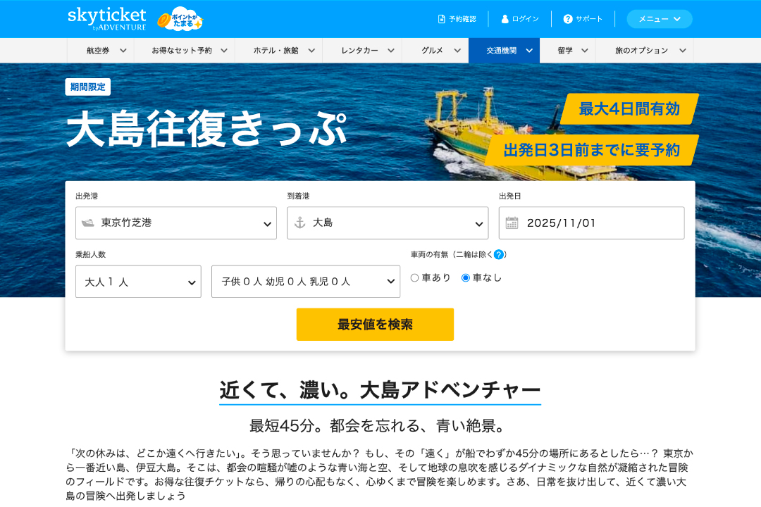 これまで電話や窓口での申込みが必要だった人気の往復乗船券「大島らくらくきっぷ」「さるさるきっぷ」が、オンライン予約サイト「skyticket」からご予約いただけるようになりました!