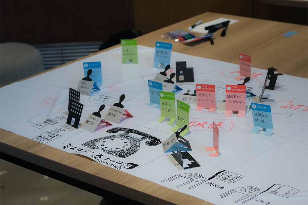 高台から港を見下ろす景色や、まちなみの空気を感じながら、参加者のみなさんは伊豆大島での体験をもとに新しい観光サービスのアイデアを考えました。