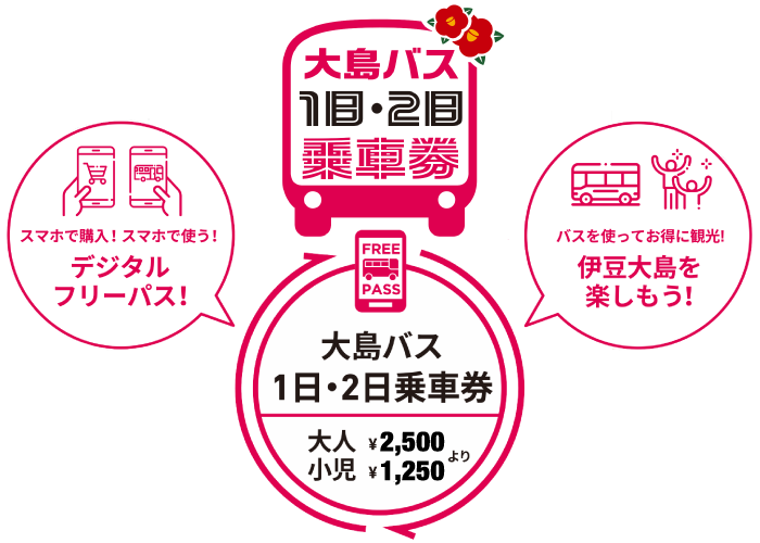 何度でも乗れて、どんどん乗れば、ぐんぐんおトク!スマホで、大島島内の観光がさらに便利に快適に!