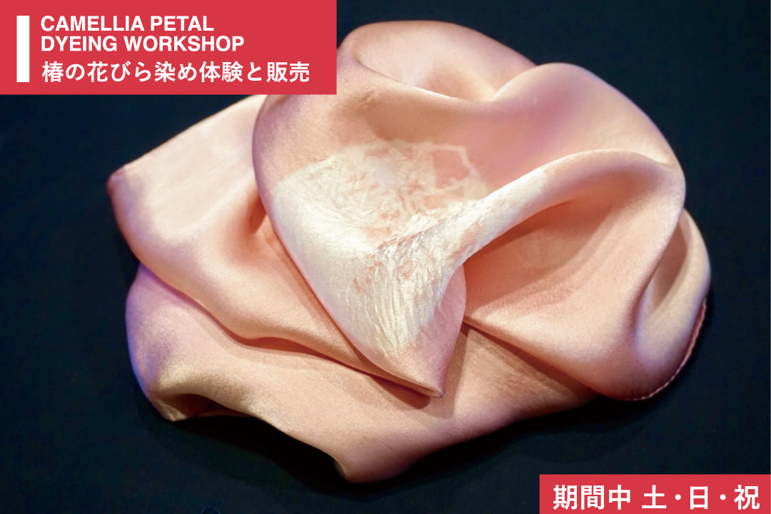 椿の花びらで、ハンカチやスカーフを淡い色合いに染める体験教室・販売(主に土日祝)を実施予定。