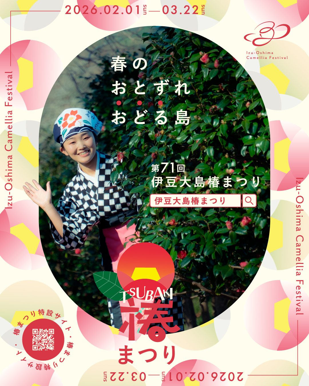 島を彩る椿の花とともに、一足早い春の訪れを楽しむ、島をあげての一大イベント「伊豆大島椿まつり」は、第71回を迎えます。今回は、サブテーマに「春のおとずれ、おどる島」を掲げ、椿の花が咲きほころぶ瞬間の高揚感や、島じゅうに広がるお祭りのような空気を表現しました。2026年2月1日から3月22日まで、椿とともにめぐる伊豆大島の風景と、心おどる春の気配をお楽しみください。総合案内所(メイン会場)は、元町港船客待合所へ。島の玄関口から各地を巡り歩きながら、春のおとずれとともに“おどる島・伊豆大島”をご堪能ください。