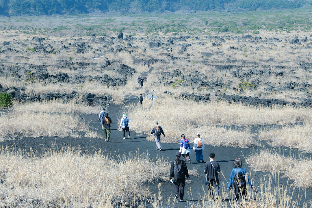 フィールドワークのスタートは、三原山エリアでのトレッキングから。