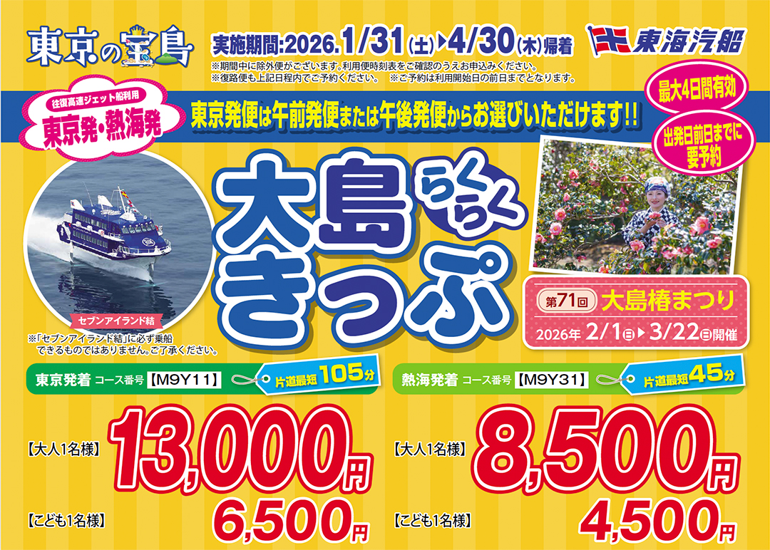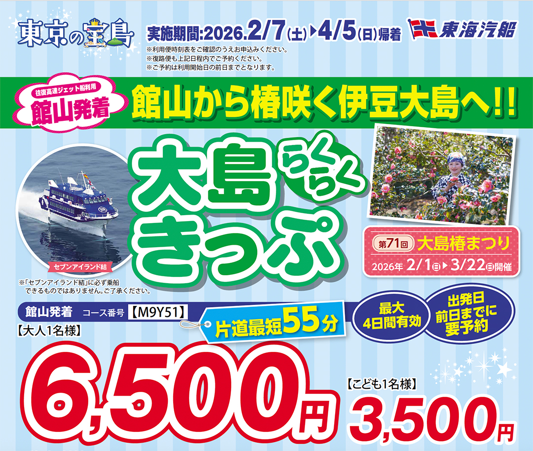 高速ジェット船往復乗船チケットや大型客船利用が大きく値下げされたプランが登場しました!超お得なプランで伊豆大島を思う存分満喫しよう!!