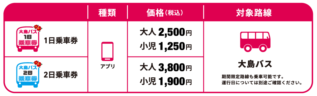 「大島バス1日乗車券」と「大島バス2日乗車券」のモバイルチケットは大島バスの全路線で乗り降り自由、料金は下記のとおりです。