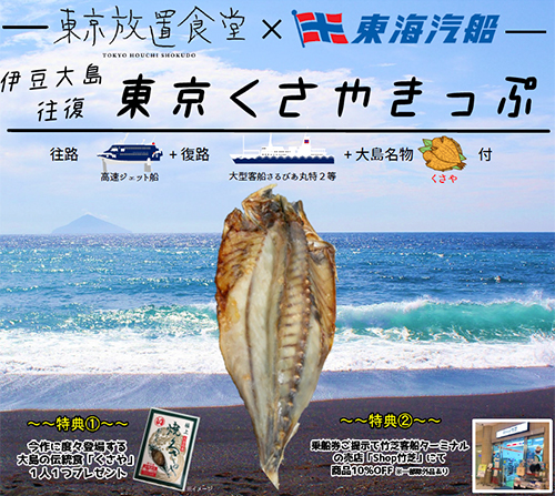 竹芝客船ターミナル内売店「SHOP竹芝」にて商品10%OFFの特典や、大島名物の『くさや』と除菌ウェットティッシュがセットになったお得な東京-大島往復乗船チケットです。