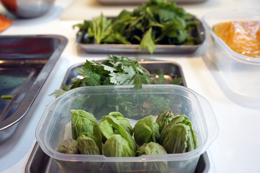 今回、天ぷらで揚げる食材は、明日葉、ふきのとう、ヨモギ、絹さや等々。