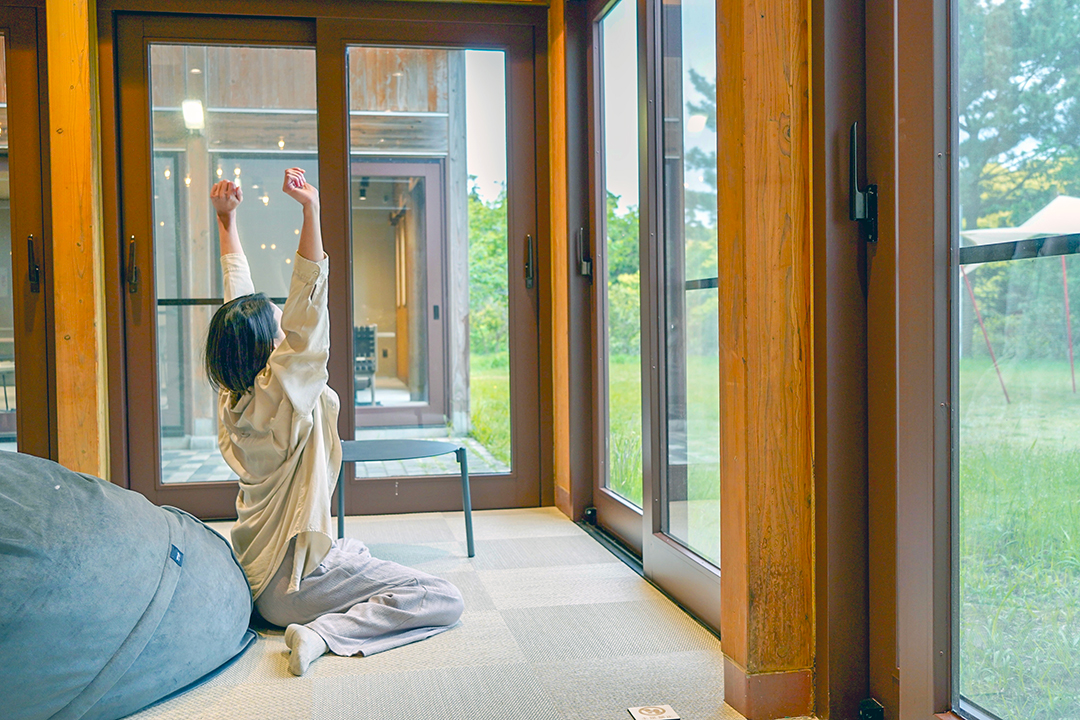 そして、WELAGO周辺の自然豊かな環境を直接感じることができる屋外スペース(通称「SHIBAFU」)には、天候の良い日やイベントに合わせてキャンプギアを設置して、開放感あふれる環境の中でミーティングや作業を行うことができます。例えば、WELAGO主催のイベントでは、焚き火台を設置して炎を囲みながら参加者同士コミュニケーションを深めたり、共通の話題に対してアイデアを深めるなど、チームビルディングに大きな効果を発揮しています。