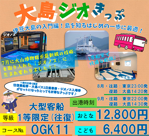 大型客船1等往復乗船券+大島バス1日乗車券+ジオノス入場券がセットになったお得なきっぷです。