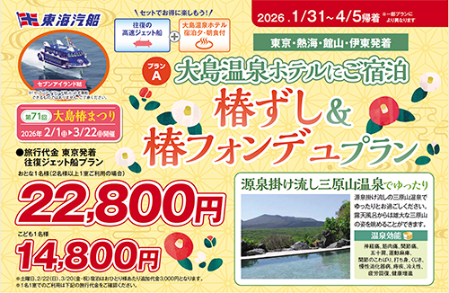 大島温泉ホテル宿泊「椿ずし&椿フォンデュプラン」「プレミアム洋室宿泊プラン」(2026.1.31~4.5帰着)