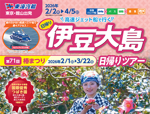 椿の楽園『伊豆大島めぐり』。往復の高速ジェット船と島内の観光バスがセットになったとってもお得な日帰りツアーです。
