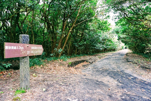 温泉ホテルルートへの入口は大島温泉ホテルの駐車場付近にあります。『富士箱根伊豆国立公園 三原山内遊歩道案内図』の看板が目印です。そこからしばらく下り坂を下っていくと、「裏砂漠線3.2km」の看板があるので、それを目印にしてください。